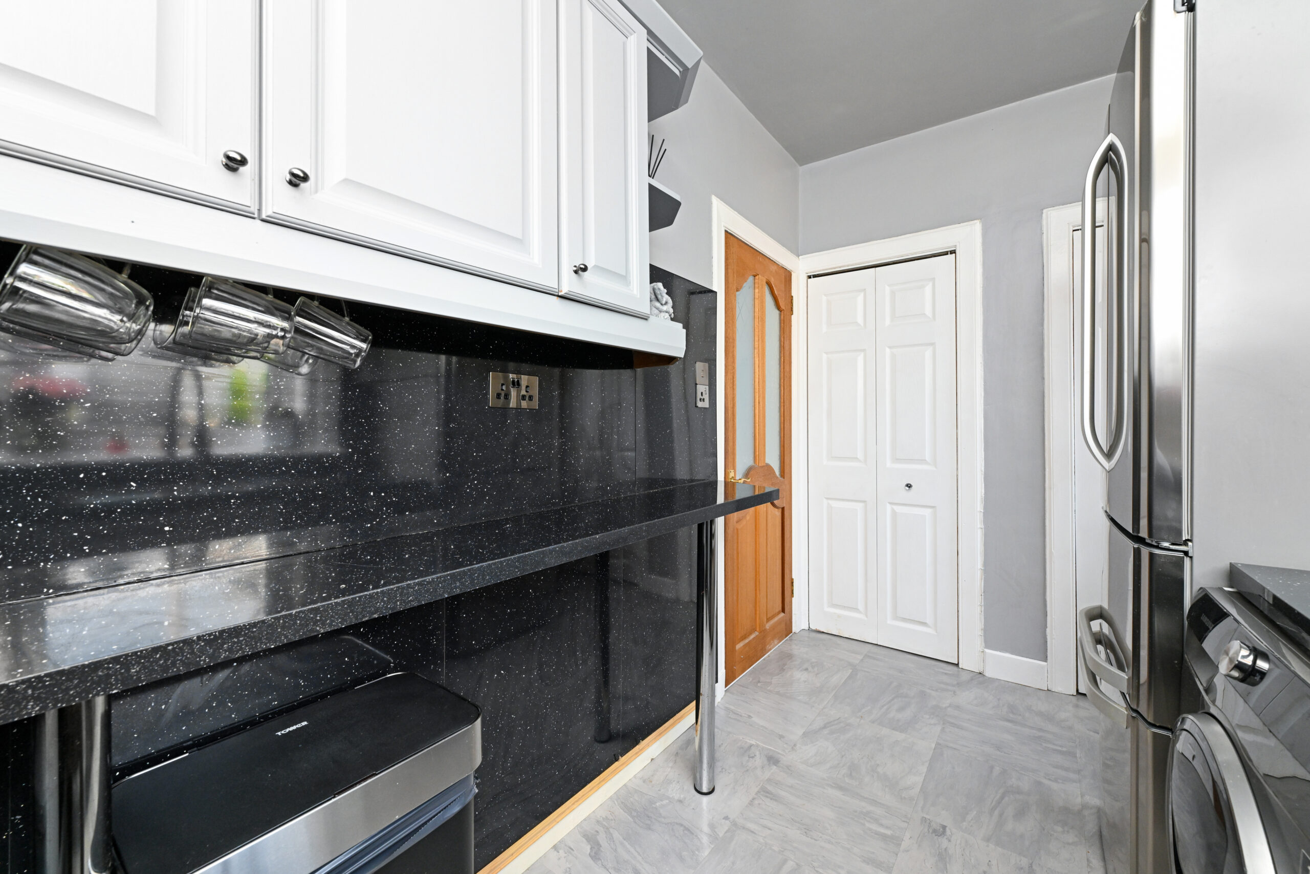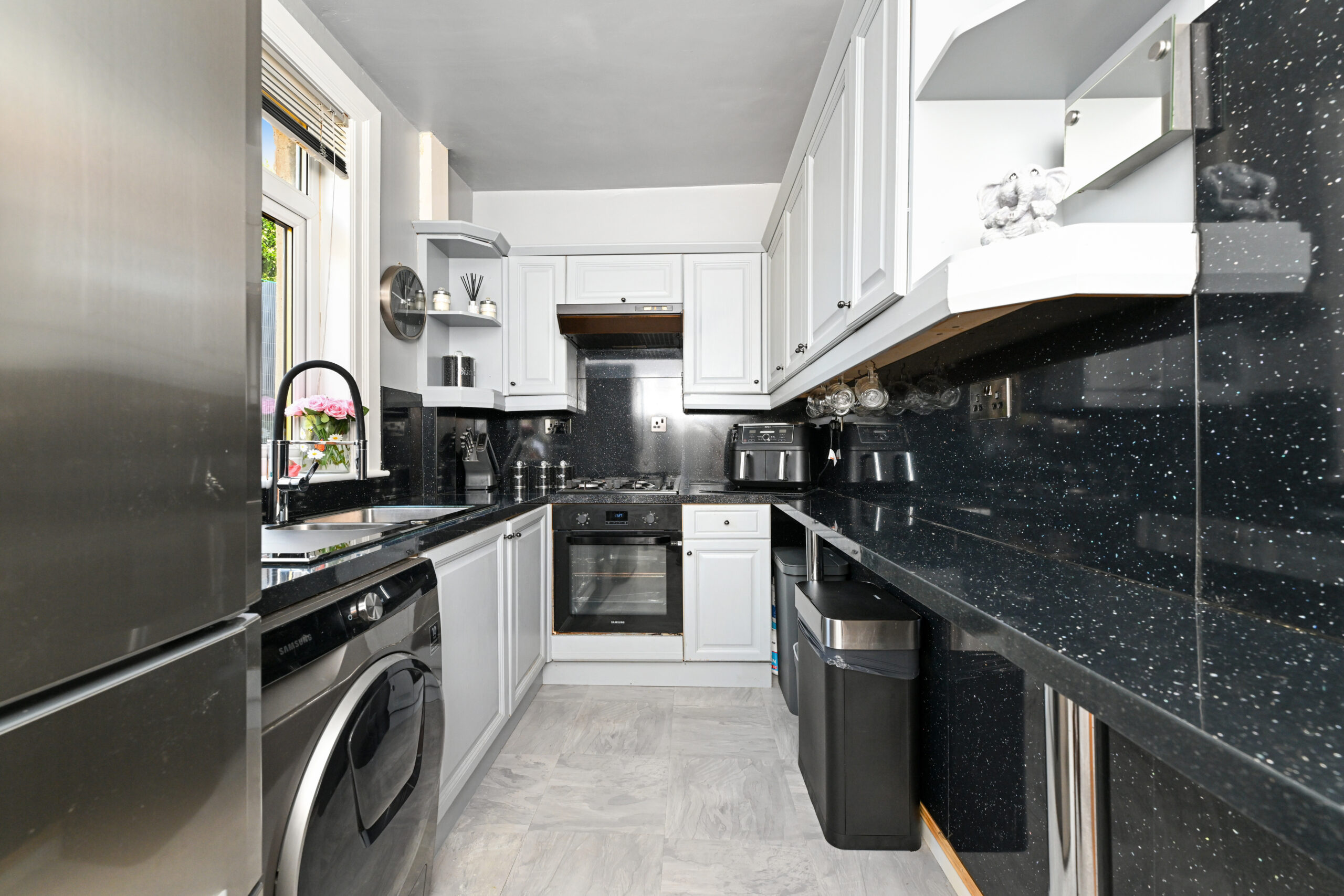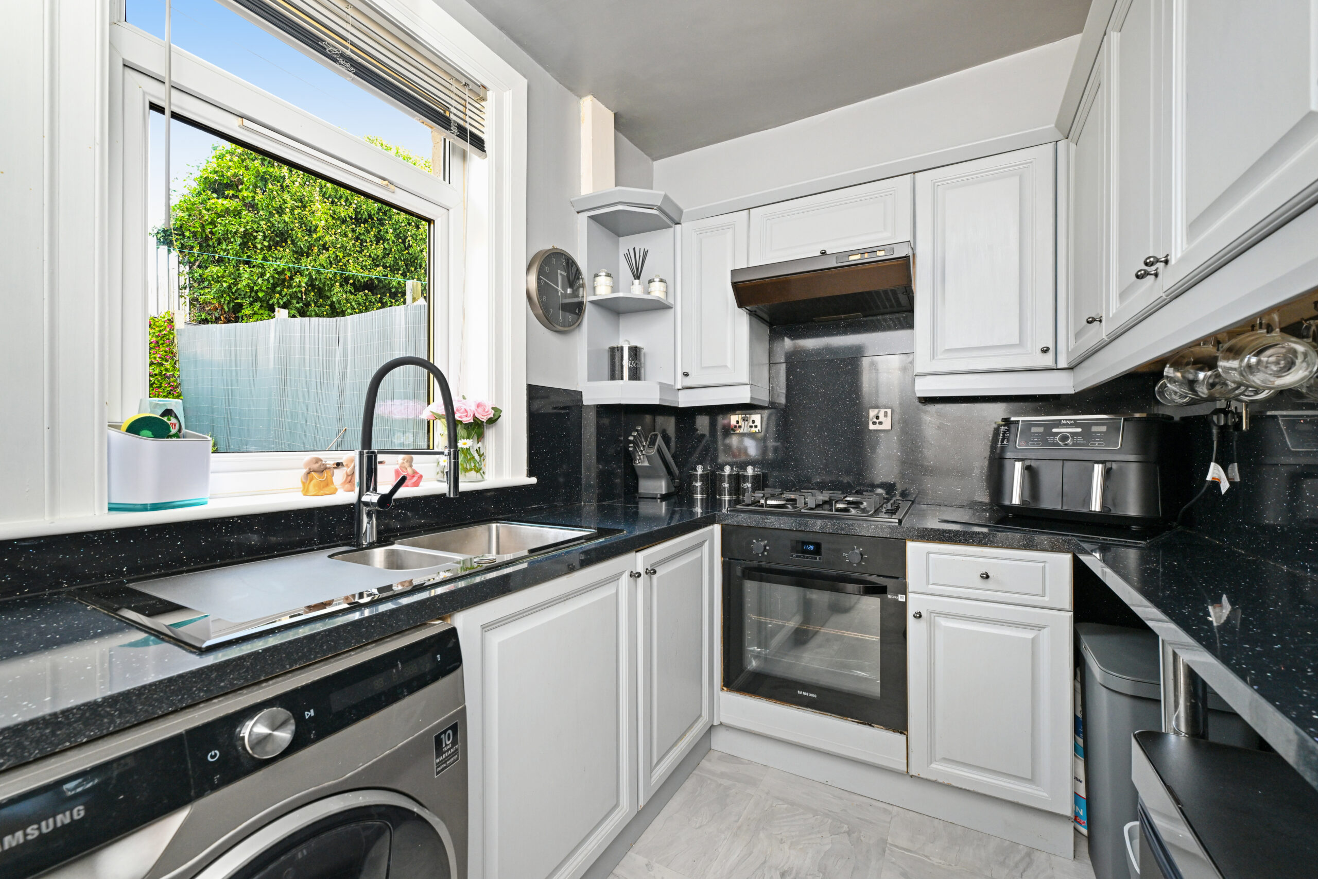 The property opens to an entrance hallway which has stairs to the upper level and the living room off. The bright, front facing living room features a bay window, gas powered fire within a surround, a handy built in cupboard, and the kitchen off. The kitchen is situated to the rear and has base and wall units, integrated oven and gas hob, freestanding washing machine, 2 built-in pantry cupboards, and gives direct access to the rear garden.