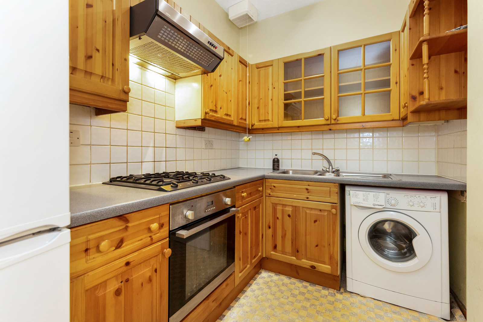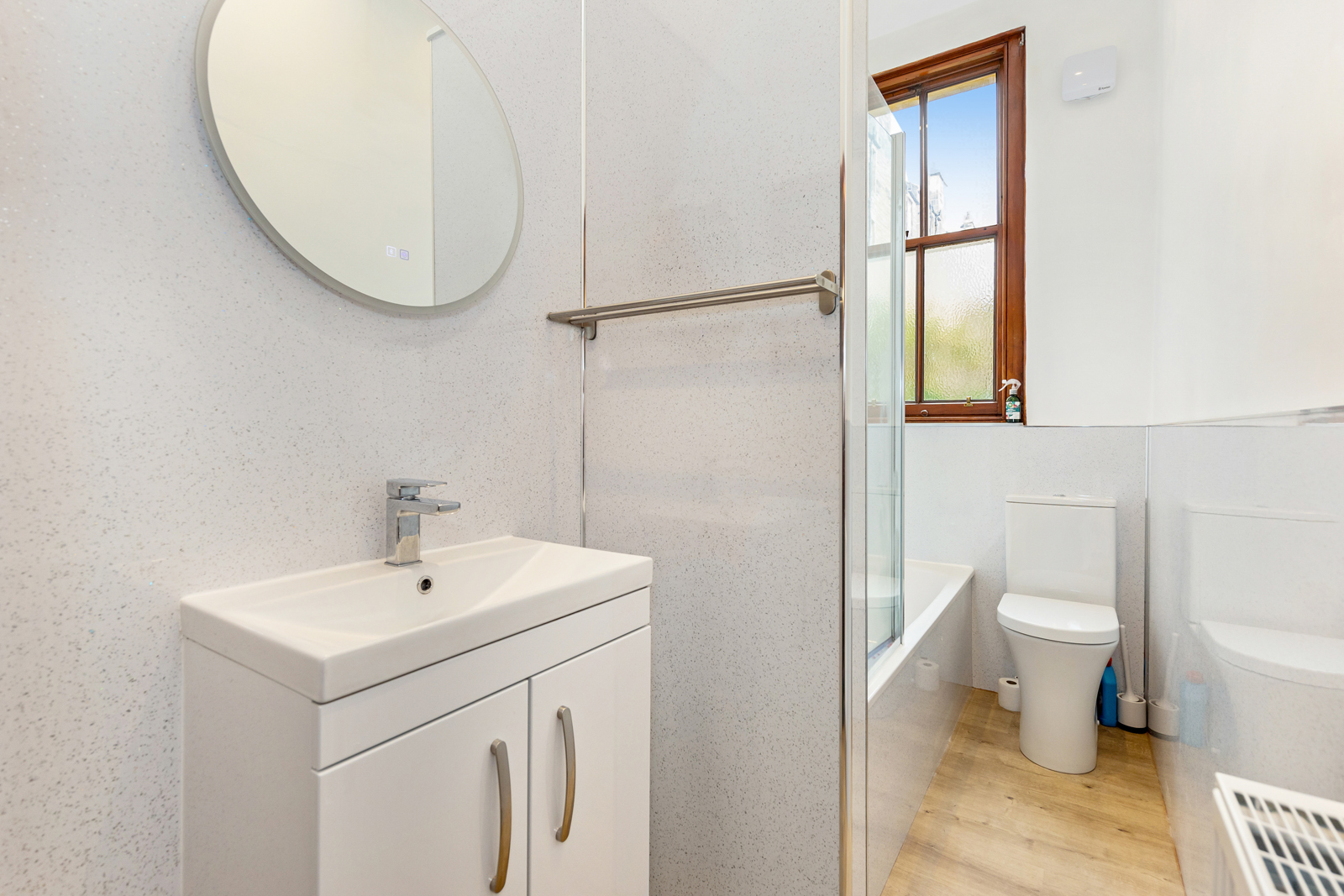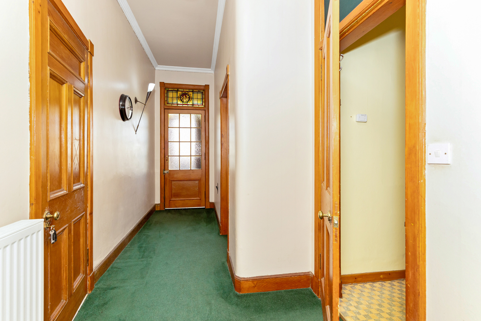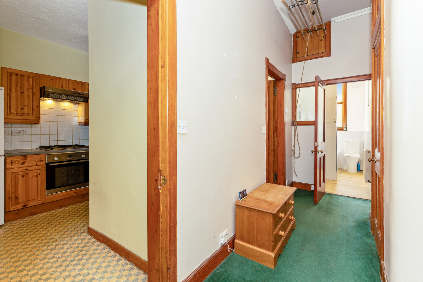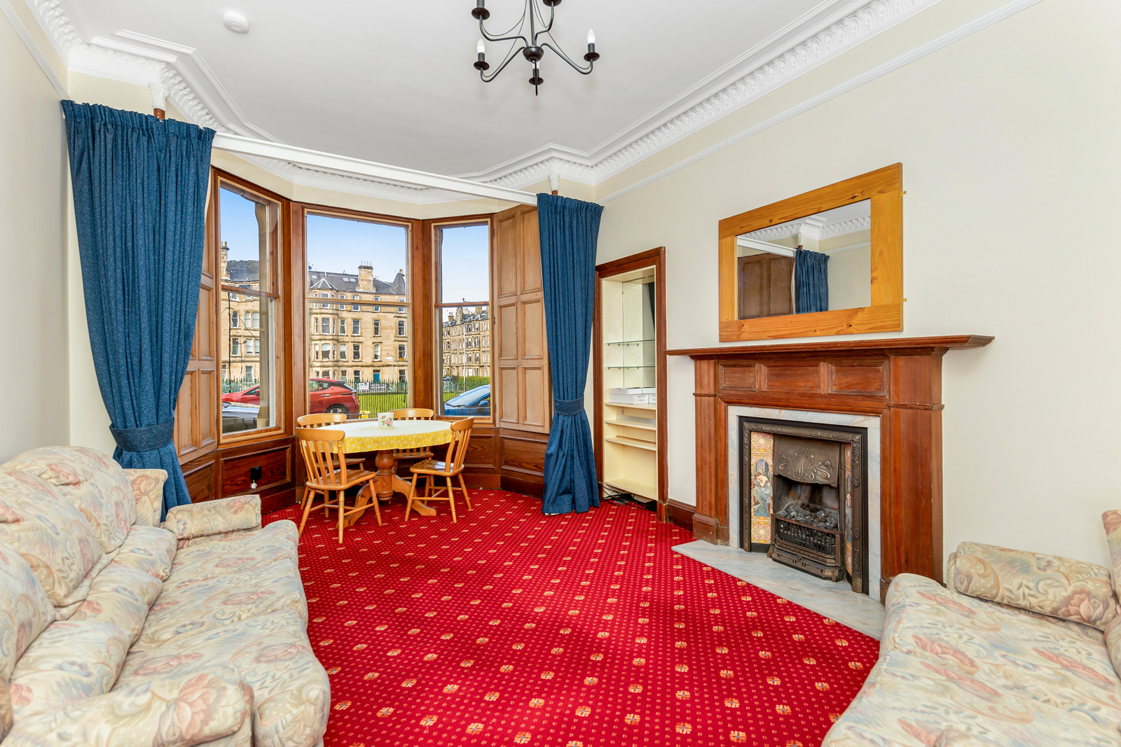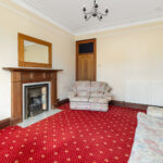 The property opens to an entrance vestibule featuring tiled floor and an impressive stained glass transom window. The hallway gives access to the rest of the accommodation, has a handy built in cupboard and also a door to the shared stair. To the front of the flat is a spacious living room which enjoys several traditional features including a bay window with working shutters (and secondary glazing), a fireplace within a traditional surround, Edinburgh Press and ornate cornice. The internal kitchen benefits from base and wall units, integrated oven with gas hob, and a freestanding washing machine. There are 2 bedrooms to the rear, the largest of which features 2 built-in cupboards. Completing the property is a modern rear facing bathroom with splashboard walls, WC, wash hand basin within a vanity unit, and a bath with an overhead mains powered shower.
