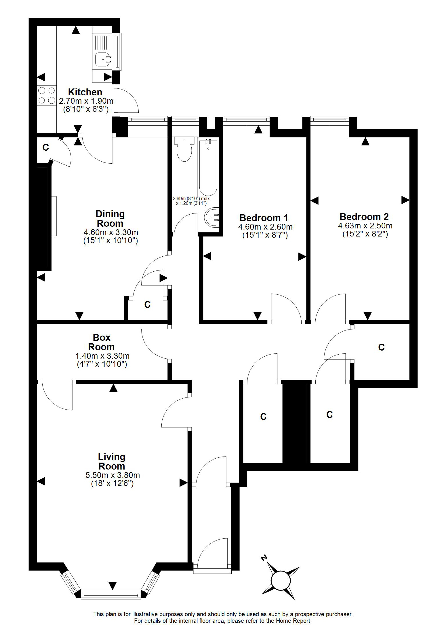 The flat is accessed via a private main door which opens to an entrance vestibule with ornate tiles. The hallway gives access to the rest of the flat and has three handy built in storage cupboards. The spacious living room is situated to the front and has a bay window, ornate cornice, an electric powered fire within a wooden surround and has access to the box room. To the rear is a dining room with an electric powered fireplace, two built in storage cupboards and has the kitchen off. The kitchen gives direct access to the garden, has base and wall units, slot in cooker, undercounter fridge, freezer, and a washing machine. The flat benefits from two double bedrooms to the rear. A box room can be accessed via both the hallway and the living room and would make an ideal study space. Completing the accommodation is a rear facing bathroom which comprises of a bath with overhead electric powered shower unit (shower not working), WC, and a wash hand basin.
